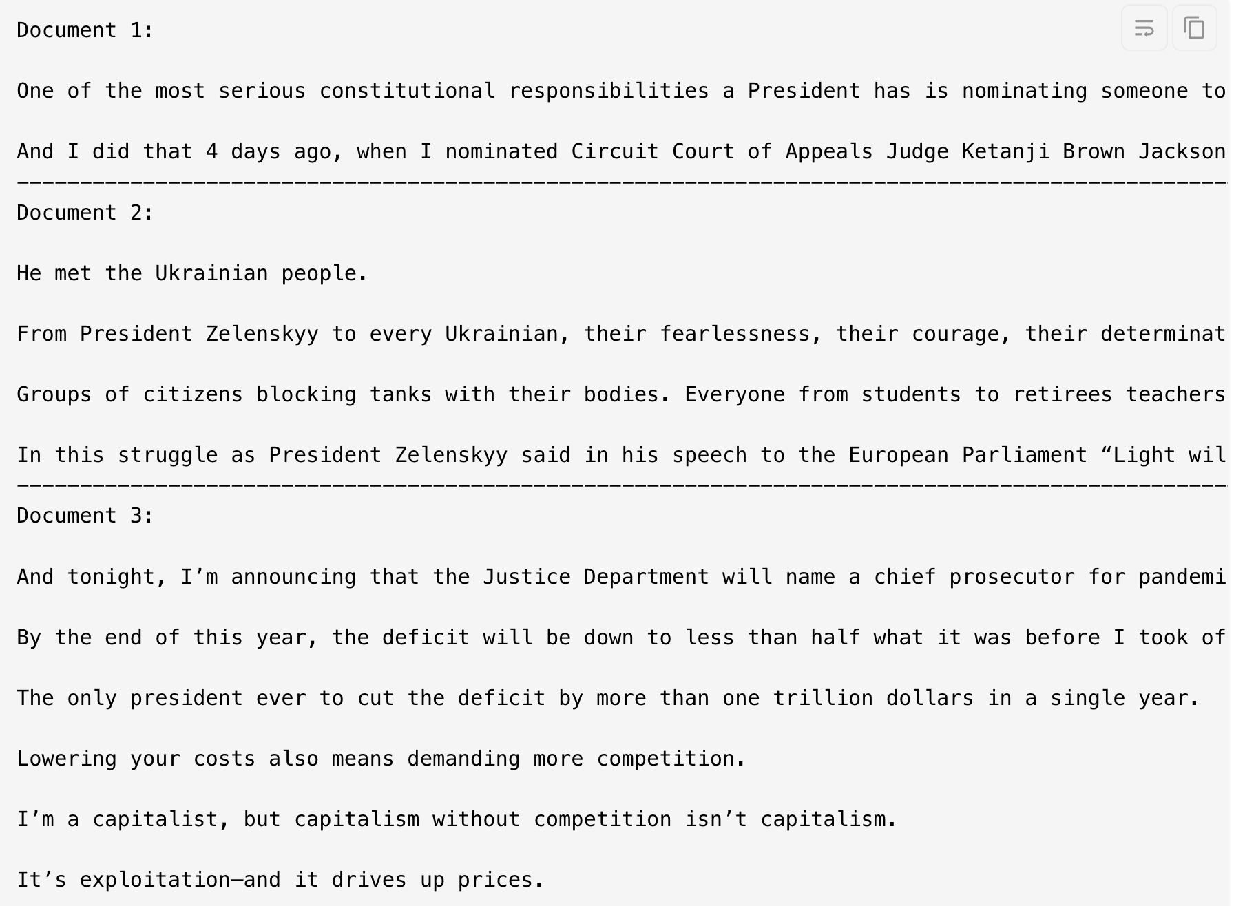 - 将搜索得到的 top-k 文档块的原始数据拼接后放在上下文中一起发送给大语言模型
