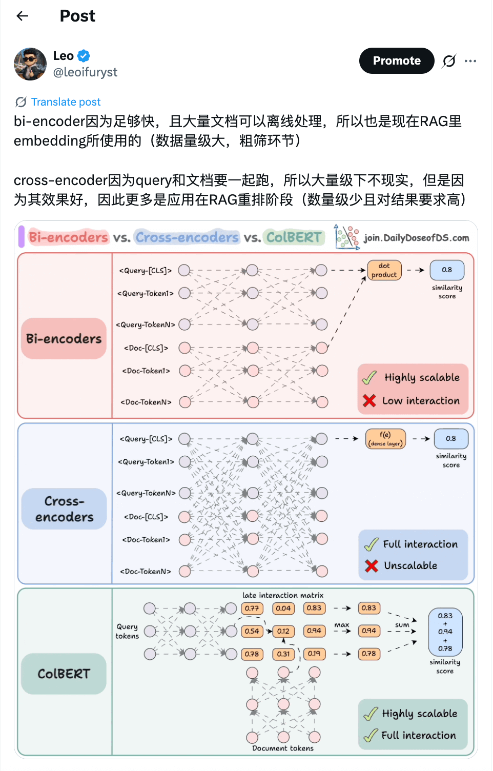两者各有优缺点,因此很多系统或者应用场景会将两者进行结合,比如用稀疏检索(如 BM25)结合稠密检索先召回 Top K 文档,再用重排模型(Dense Reranker,如 Cross-Encoder)对结果进行重新排序,重新排序 引用一张我之前发的关于 Bi-Encoder 和 Cross-Encoder: